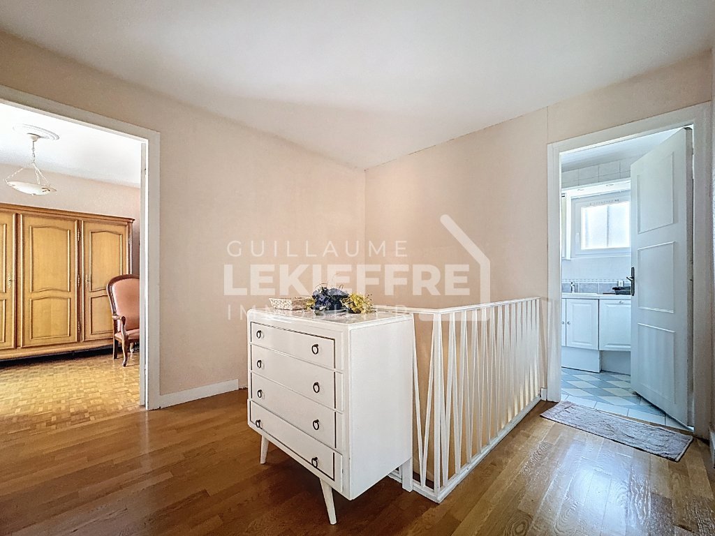A l'étage: Après avoir franchi l'entrée, vous découvrirez un séjour traversant très lumineux (40m2), une cuisine équipée, une véranda, une terrasse donnant sur le jardin